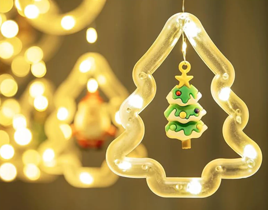 -Cortina de luces navideñas con LED de color blanco cálido, con 10 lindos colgantes (Santa Claus*2/Reno*2/Árbol de Navidad*2/Sombrero de Navidad*2/Muñeco de nieve*2) que brillan cálidamente, se suma a la sensación de ambiente navideño.