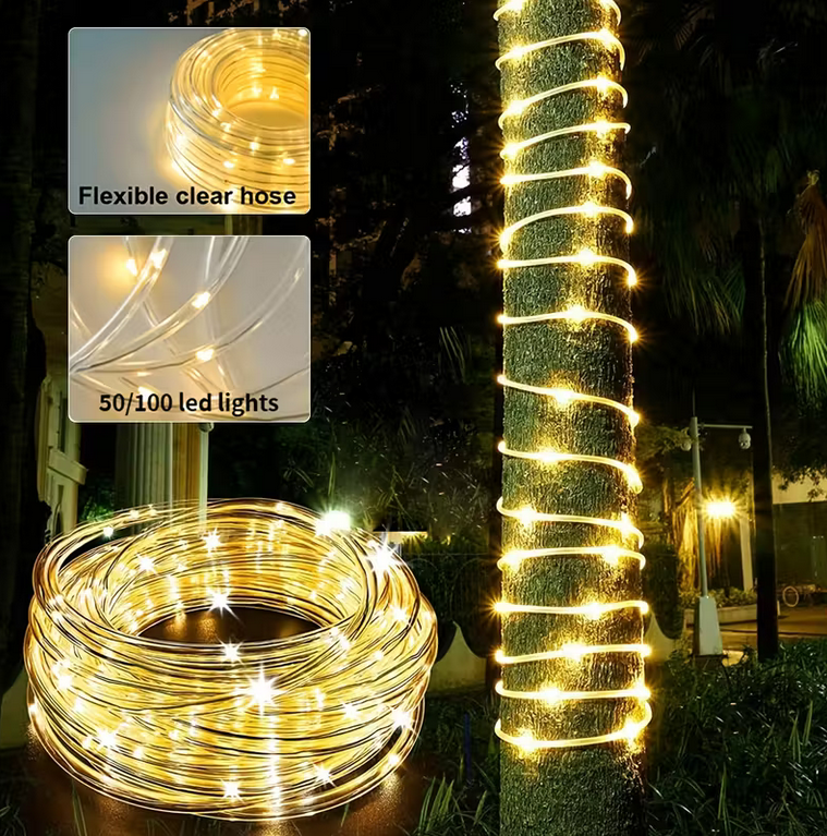 Sus 100 luces LED de bajo consumo ofrecen una iluminación cálida, continua y duradera, ideal para destacar ambientes con un toque moderno y elegante.